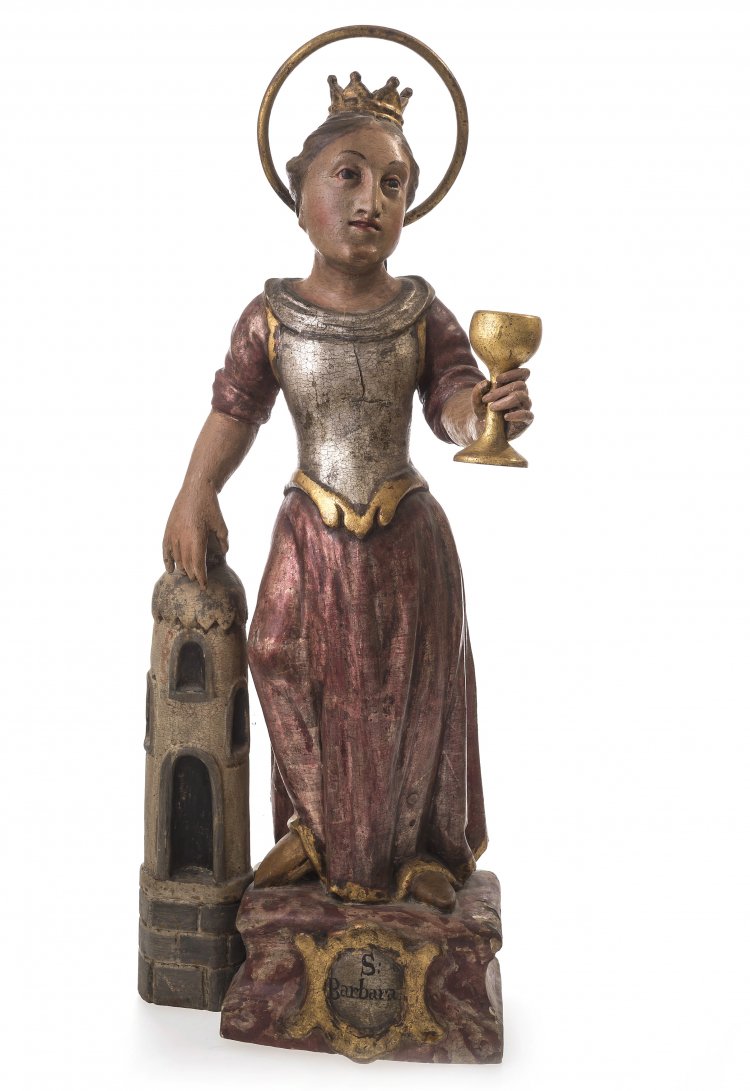 Süddeutsch, 18. Jh Stehend in langem Gewand, mit Kelch und Turm neben sich. Holz, übergangene Farbfassung. Rücks. dat. 17 81(?). H. 48 cm.