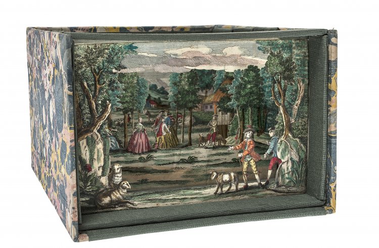 Um 1800. Schäferszene vor Meierei. Kol. Kupferstiche, ausgeschnitten, Karton. 10 x 15 x 18 cm.