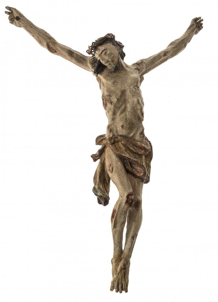 Süddeutsch, 18. Jh. Sog. Pestchristus mit deutlich ausgeprägten Wundmalen. Dreinageltypus. Holz, Farbfassung. Best. H. 48 cm.