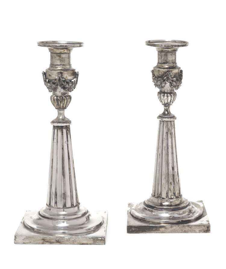 Augsburg, 1797-1799, MZ: "PFB", Philipp Friedrich Bruglocher, wird 1771 Meister. Auf quadratischem Stand konischer, kannelierter Säulenfuß, darauf Vase und applizierte Blütenfestons. Min. best., eine Traufschale rep. Gemarkt. Ca. 840 g. H. je 26 cm. Lit.: Seling, 2007, Nr. 2531 bzw. 2730.