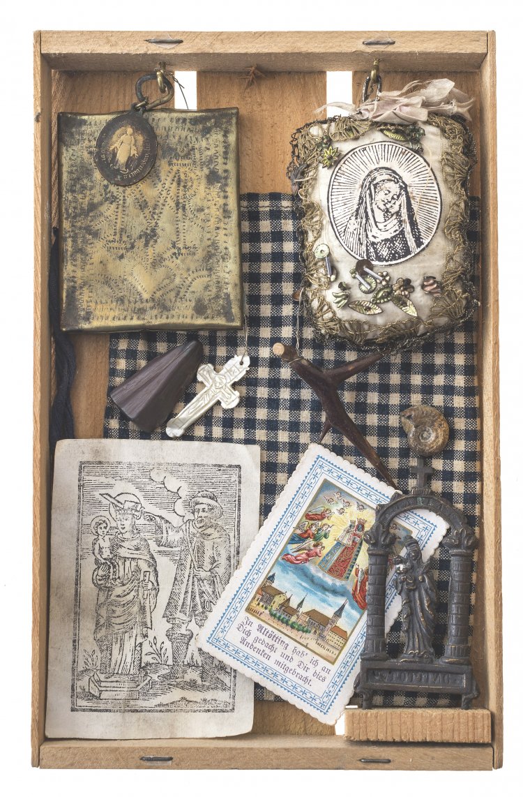 U.a. Messing- und Stoffbreverl, Gnadenmadonna. L. je 7 cm.