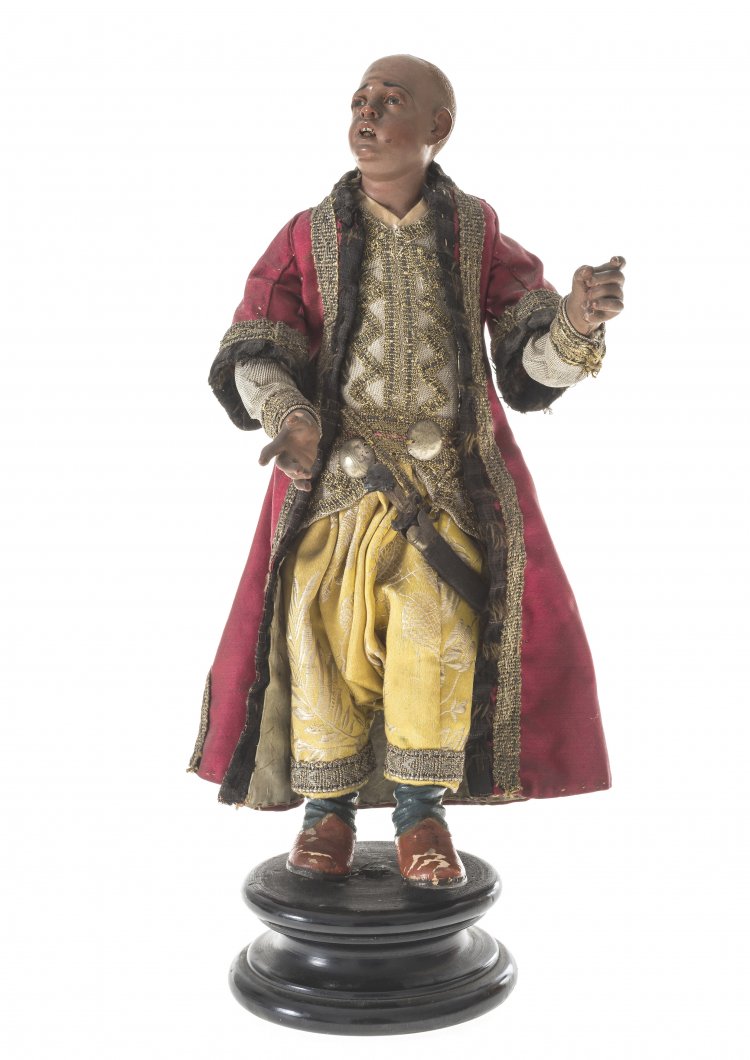 Neapel, 18. Jh. Mongolenpage. Terrakotta, Holz, farbig gefasst, Glasaugen, originale, textile Kleidung. Best., rest. Dazu Holzsockel. H. 26 cm.