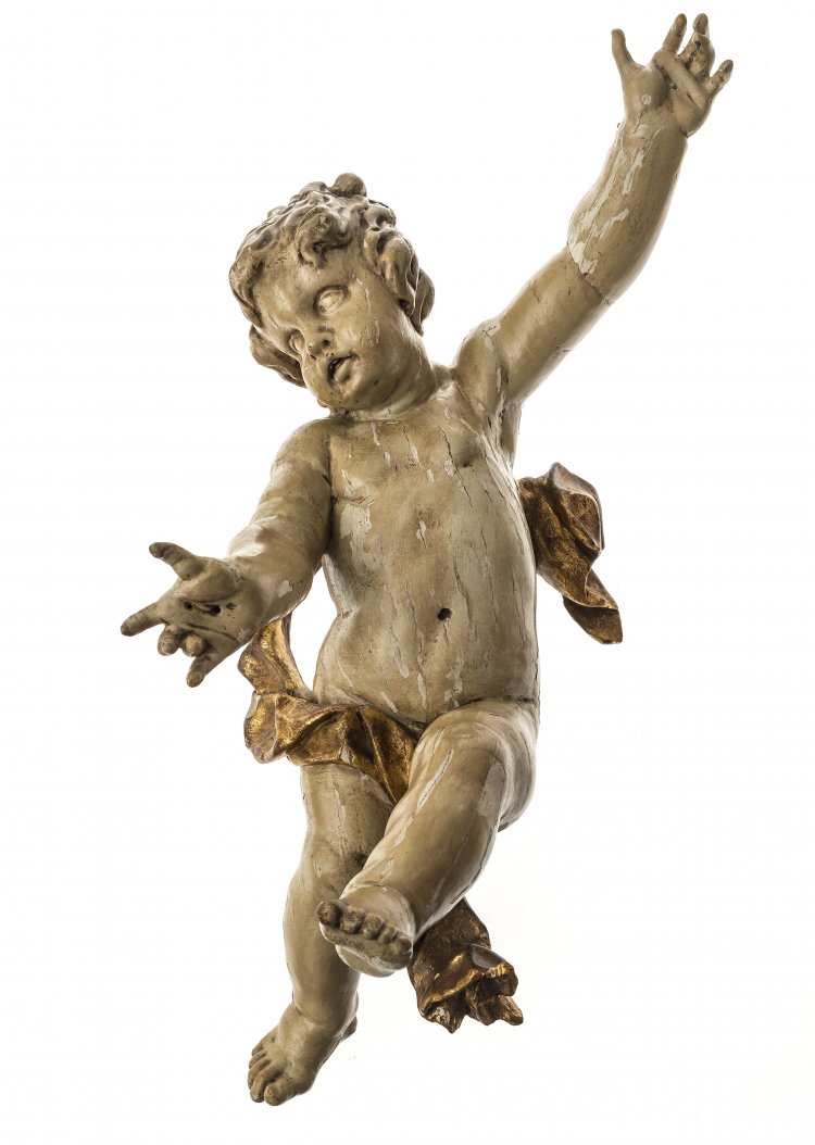 Süddeutsch, 18. Jh. Schwebend, mit Tuchdraperie. Holz, vollrund ausgeführt, Inkarnat- und Goldfassung. Besch. H. 62 cm
