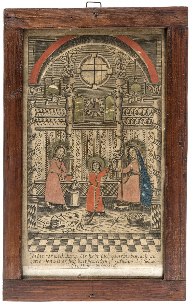 Um 1800. Heilige Familie. Mit Sinnspruch. Kupferstich. Alterungsspuren. 29,5 x 17 cm.