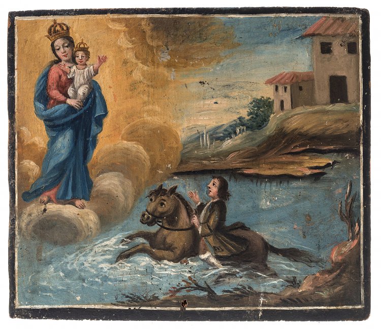 Bayern, 18./19. Jh. Muttergottes und Reiter mit Pferd im Fluss. Tempera/Holz. 24 x 27 cm. Besch.