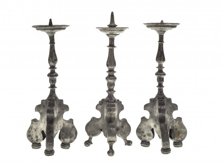 Zinn. Dreiseitiger Volutenfuß mit mehrfach gegliedertem Balusterschaft. Ein Docht verändert. H. 21-23 cm.