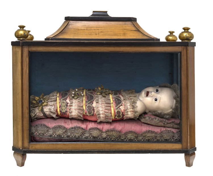Süddeutsch, 19. Jh. Kopf aus Wachs, Glasaugen, mit Brokat und Spitze gefatschter Körper. Schrein mit Kirschbaumfurnier, Kugelbekrönungen. Frontglas fehlt. 47 x 55 x 25 cm.