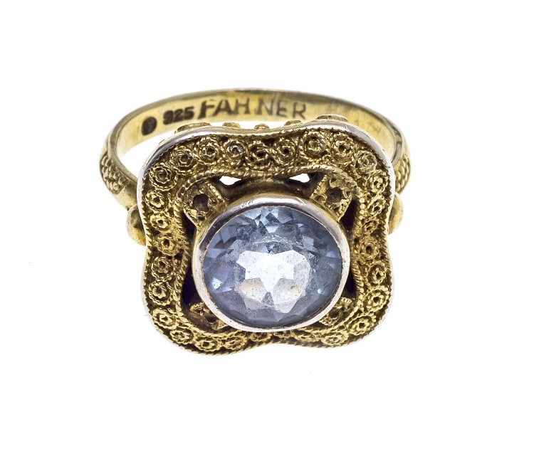 Ring. Silber (925), vergoldet. Ringkopf mit rundem Aquamarin, umgeben von Band aus spiralförmigem Silberdraht. Leicht best. Sign. Ringweite 53.
