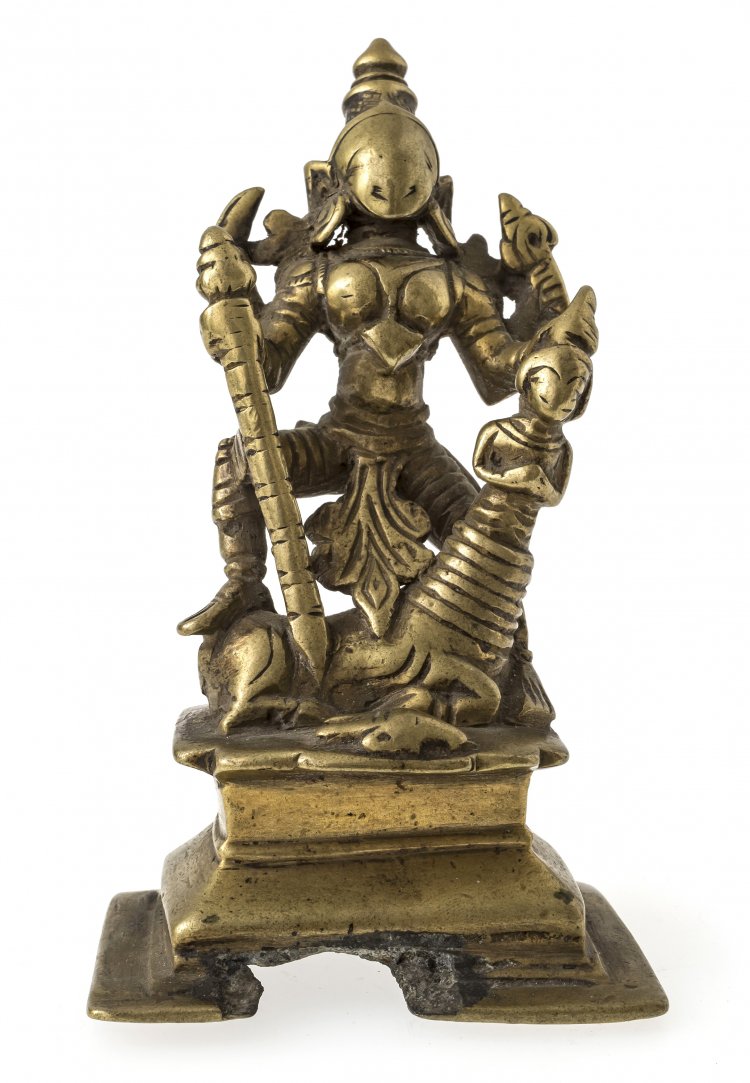 Indien. Bronze. Auf einem Dämon stehehnd, mit Schwert. Besch., Baldachin fehlt. H. 11 cm.