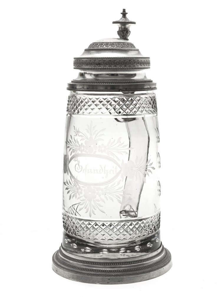 Farbloses Glas, schauseitig mit Matt- und Steinelschliff und Blütenkartusche, bez. "Gesundheit". Bodenring und Deckel aus Zinn. H. 23 cm.