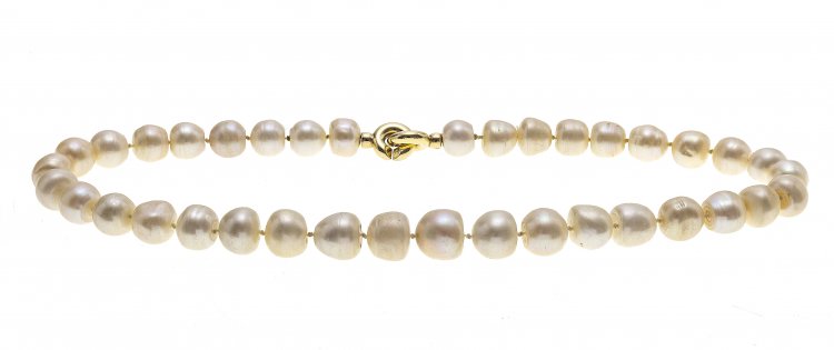 Süßwasser-Zuchtperlen, unregelmäßig, ø ca. 7-10 mm, verlaufend. L. 45 cm.