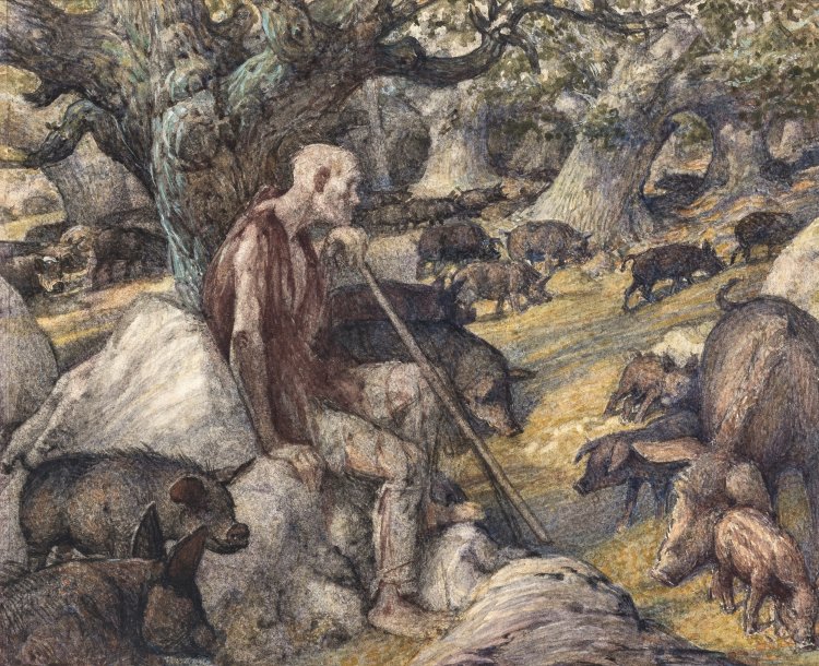 Rastender Schweinehirte unter Bäumen. Gouache. 15 x 18,5 cm. Unsign.