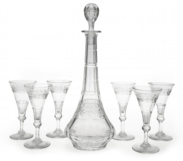 Farbloses, geschliffenes Glas. 7-teilig: 1 Karaffe, 6 Kelchgläser. 1 Glas min. best. H. 11-27 cm.