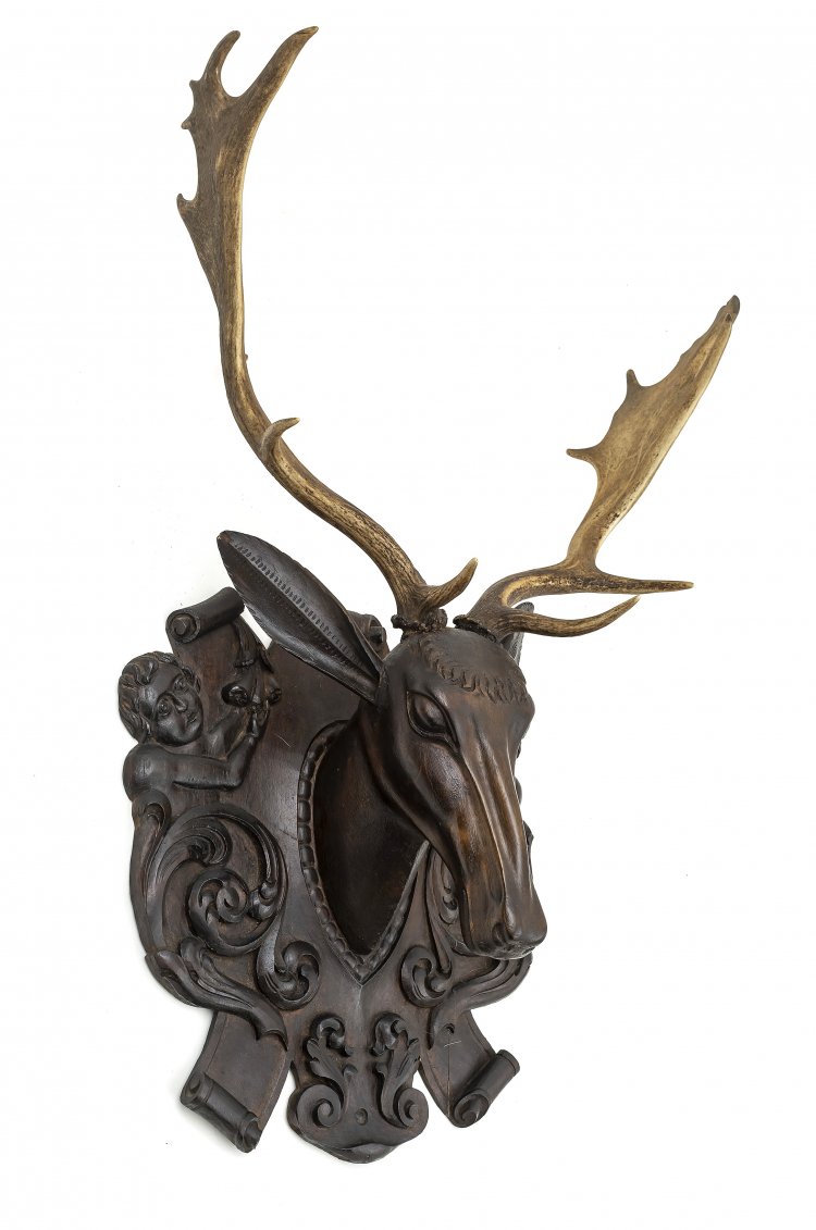 Geweih (Dammwild). Holz auf geschnitzter Kartusche montiert. H. mit Geweih 76 cm.