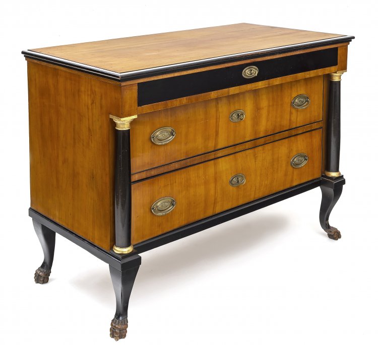 Süddeutschland (Franken), um 1820. Kirschbaum, furniert, tw. geschwärtz. Dreischübig, Front mit toskanischen Säulen auf Krallenfüßen. Guter Erhaltunszustand, tw. originale Patina, min. rest. 90 x 118 x 60 cm.