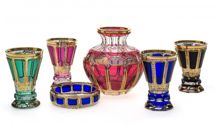 Deutsch, wohl Steiner & Vogel, um 1930. 6-teilig: 1 Vase, 4 Fußbecher, 1 Schälchen. Farbloses Glas mit Leistenschliff, rosafarbener, rubinroter, blauer und grüner Überfang, Goldmalerei. H. 3-16 cm.