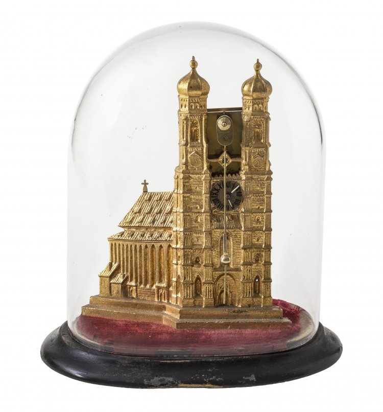 Um 1900. Metall, goldfarben gefasst. Unter Glassturz. Werk nicht auf Gangbarkeit geprüft. Mit Schlüssel. H. Uhr 12,5 cm.
