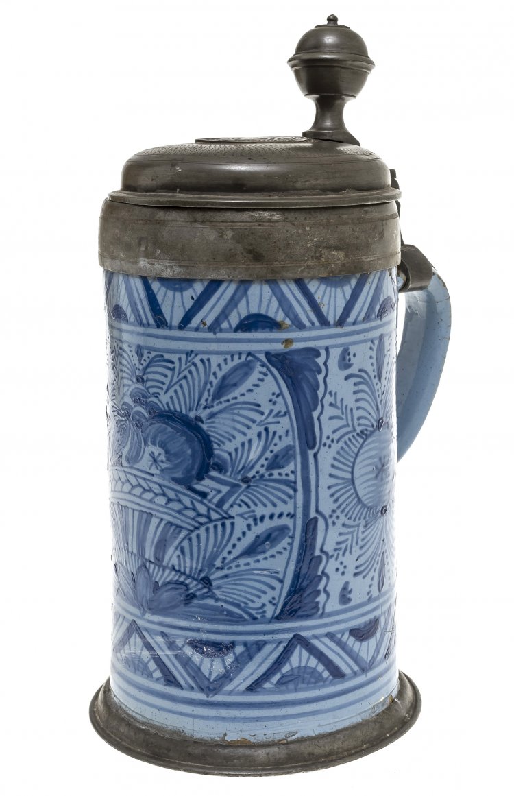 Nürnberg, 18. Jh. Fayence, Blaumalerei, Früchtekorbmotiv. Zinndeckel mit Münzeinlage, gemarkt. Besch., rest. H. 26 cm.