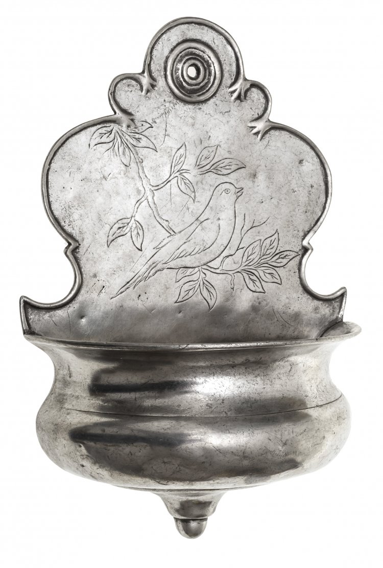 Um 1900. Zinn. Wandkartusche mit graviertem Vogel auf einem Ast. Best. H. 29 cm.