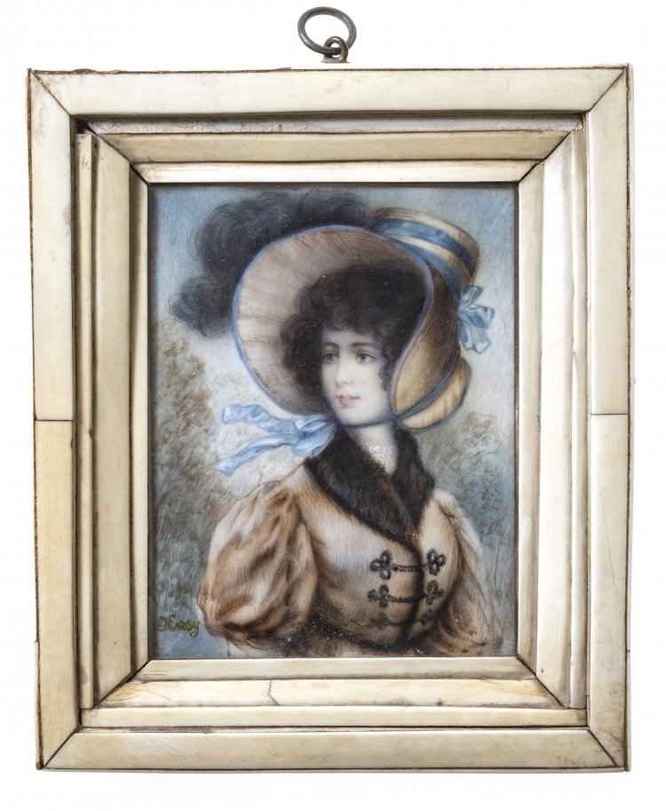 Englisch, 19. Jh. Brustporträt einer Dame mit opulentem Hut. Undeutlich sign.: J. Ea...by. Rahmen mit Elfenbeinauflagen. 8,5 x 6,5 cm.