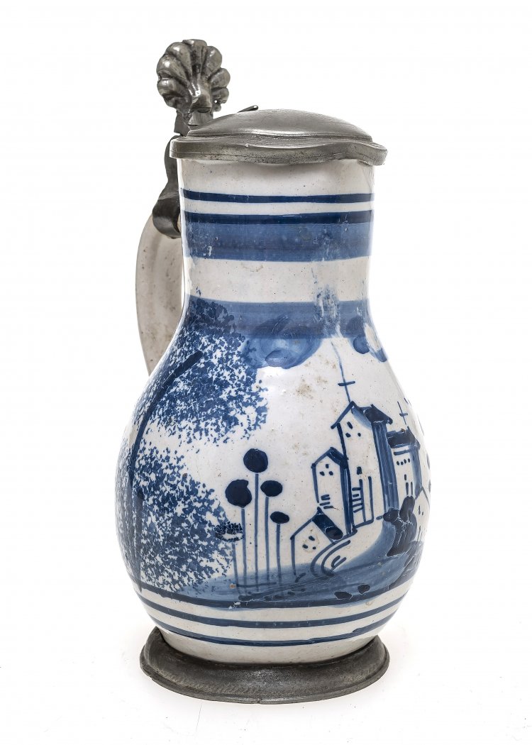 Thüringen, um 1750. Fayence, Blaumalerei. Schauseitig Architekturmotiv. Zinndeckel, Daumenrast erg., Malerei min. rest. H. 15 cm.
