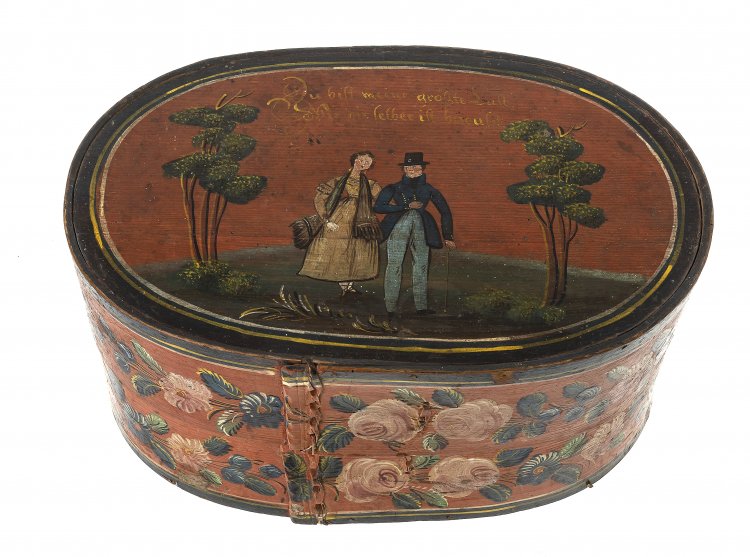 Süddeutsch, 19. Jh. Farbig bemalt, Wandung mit Floraldekor, auf dem Deckel Paar zwischen Bäumen, mit Sinnspruch: "Du bist meine größte Lust / Wie dir selber ist bewusst." Besch., Riss. L. 49 cm.