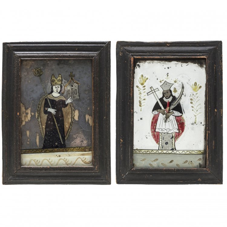 Raimundsreut, 19. Jh. Hl. Bischof (Wolfgang?) bzw. hl. Johannes von Nepomuk. Tempera/Glas. Besch., eine Rückwand fehlt. Je 19 x 13 cm.