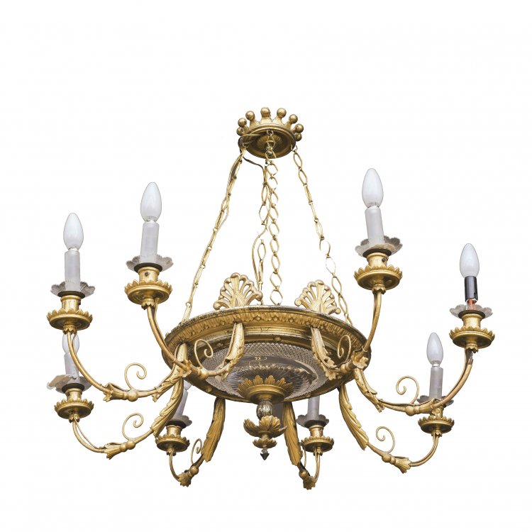 Österreich, um 1820. Achtarmig. Holz geschnitzt, vergoldet, Schale aus farblosem, geschliffenem Glas. Best., Teile lose, elektr. H. ca. 80 cm, ø ca. 90 cm.