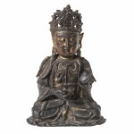 China, Ming-Dynastie, 17./18. Bronze, Reste von Vergoldung. Sitzend in vajrasana. Alterungsspuren, besch., ohne Bodenplatte. H. 29 cm. Dabei Holzsockel.