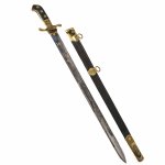 Sign.: "P. Knecht", Johann Peter Knecht, 1798 Gut Schlicken bei Solingen - 1852 Solingen. Griff mit Hornbesatz, Messingbeschläge. Gebläute Eisenklinge mit graviertem, vergoldetem Dekor und Kronenmonogr. "JMK". Mit Lederscheide (rep.) und Beimesser. L. 71 cm.