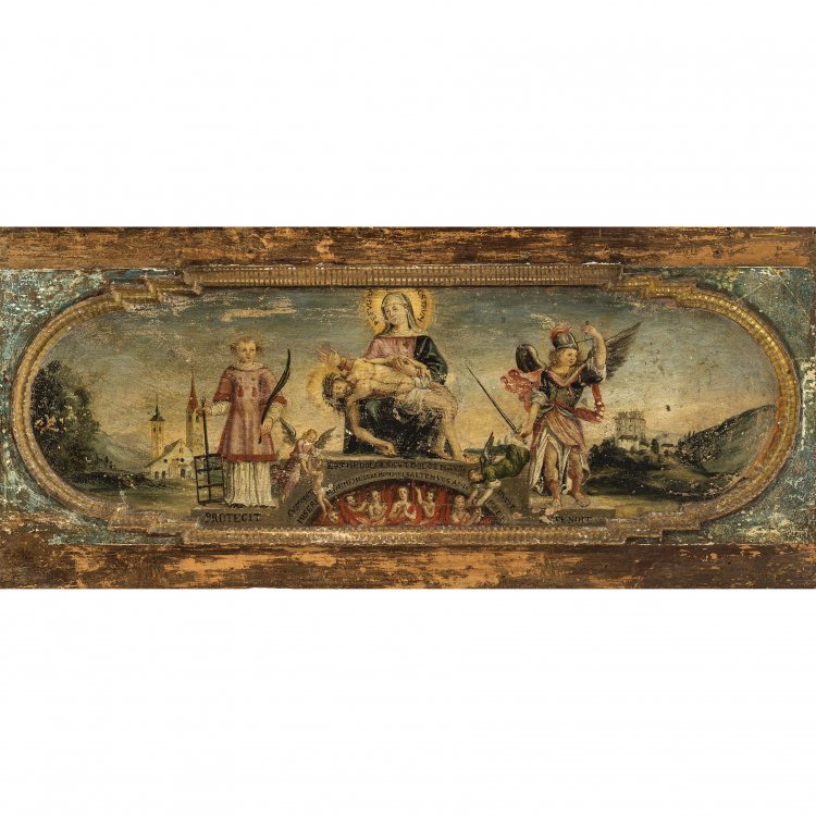 Predella mit Darstellung der Pietà über einem Fenster mit Armen Seelen, flankiert von Erzengel Michael und hl. Laurentius. Öl/Holz. 57 x 129 cm, Bildausschnitt 37 x 116 cm. Besch. Unsign.