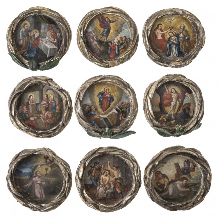 Süddeutsch, 18. Jh. Öl/Holz. Darstellung von neun Rosenkranzgeheimnissen, u.a. Krönung Mariä, Kreuztragung, Auferstehung. Geschnitzter Rosenblattrahmen, einige darunter mit applizierten Blättern. Besch. ø je 13 cm.