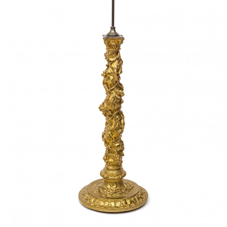 Stuck, goldfarben gefasst. Zweiflammig, mit Pergament-Lampenschirm. H. 130 cm.