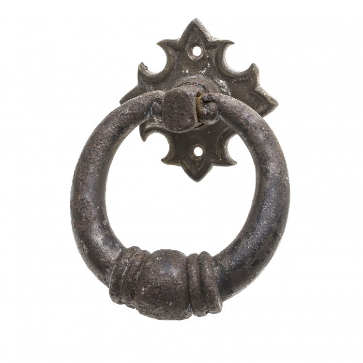 1. Jh. Eisen. Symmetrisch geschweifter Beschlag mit Ring. L. 13 cm.