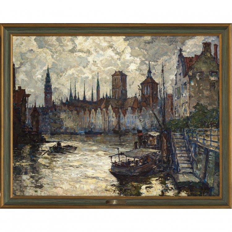 Blick auf den Hafen von Stralsund. Öl/Lw. 71 x 90 cm. Rest. Sign.