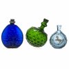 Süddeutsch. 4-teilig: 2 Schnapshunde, 2 Plattflaschen. Farbloses Pressglas mit Nuppenmuster. H. 10-14 cm.