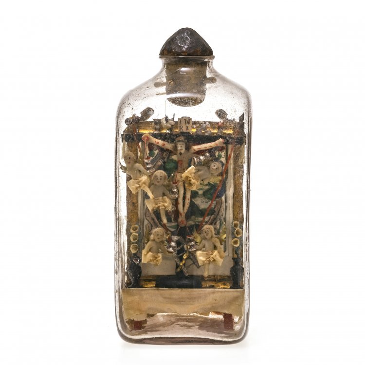 Süddeutsch, 19. Jh. Farbloses Glas, darin Altar aus Holz, goldfarben bemalt. Darstellung der "Verehrung des Kostbaren Blutes Christi," von fünf Putten umgeben, rückseitig kol. Kupferstich mit Geißelung Christi. Besch. H. 23 cm.