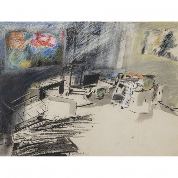 "Blick in das Atelier des Bildhauers Fritz Wotruba ". Mischtechnik/Papier. 49 x 63,5 cm. Sign.