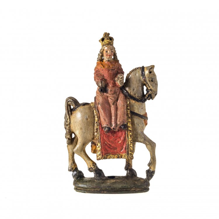 Deutsch, 17. Jh. Holz, geschnitzt, Farbfassung. Königin zu Pferd. Im Sockel Bohrloch. Min. best. H. 10 cm.