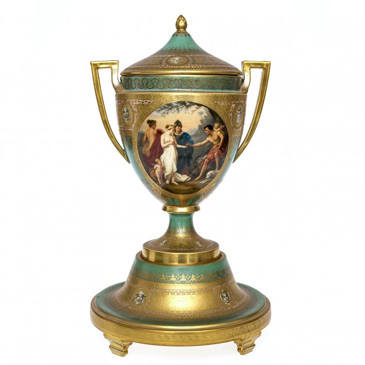 Porzellan, farbig staffiert, und goldener Reliefdekor. Reserven mit Urteil des Paris bzw. Entführung von Phoebe und Elaira nach einem Gemälde von Rubens. Dekorfriese mit antikisierenden Porträts in Grisaillemailerei. Vase unterseitig bez.: "Le ravissement de Phoebe et d´ Elaïer Le jugement de Paris". Blaue Unterglasur-Bindenschildmarke.