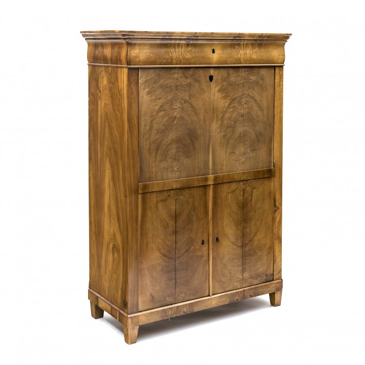 Nussbaum, furniert, zweitürig, Einrichtung innen mit Ahornfurnier. Risse, Lichtschaden. 148 x 102 x 48 cm.