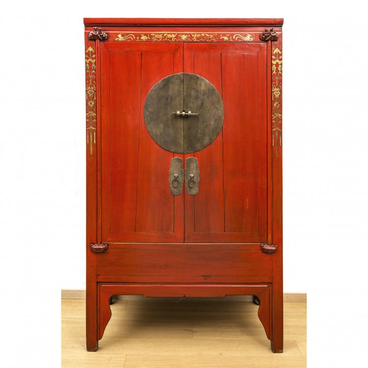 China, 20. Jh. Holz, Rotlack mit schabloniertem Golddekor. Schauseitig runder Bronzebeschlag mit Riegelverschluss. Innen zweischübig. 173 x 103 x 57 cm. Innen mit Beleuchtung, Alterungsspuren.