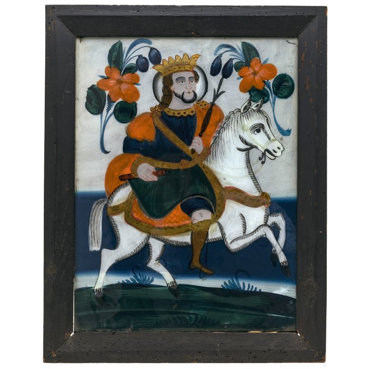 1. Jh. Hl. Wenzel zu Pferd. Tempera/Glas, 40 x 29 cm.