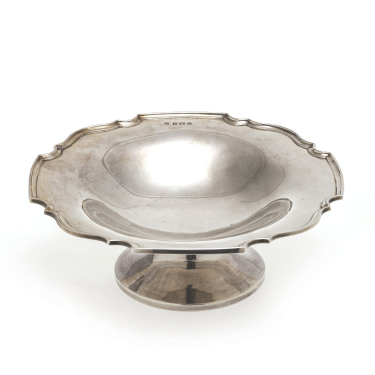 Birmingham, 1936, Firma "W.N. Ltd." Silber (Sterling). Vierpassiger, fassonierter Rand. BZ, MZ, Feingehaltsmarke. Ca. 180 g. H. 7 cm, ø 17 cm.