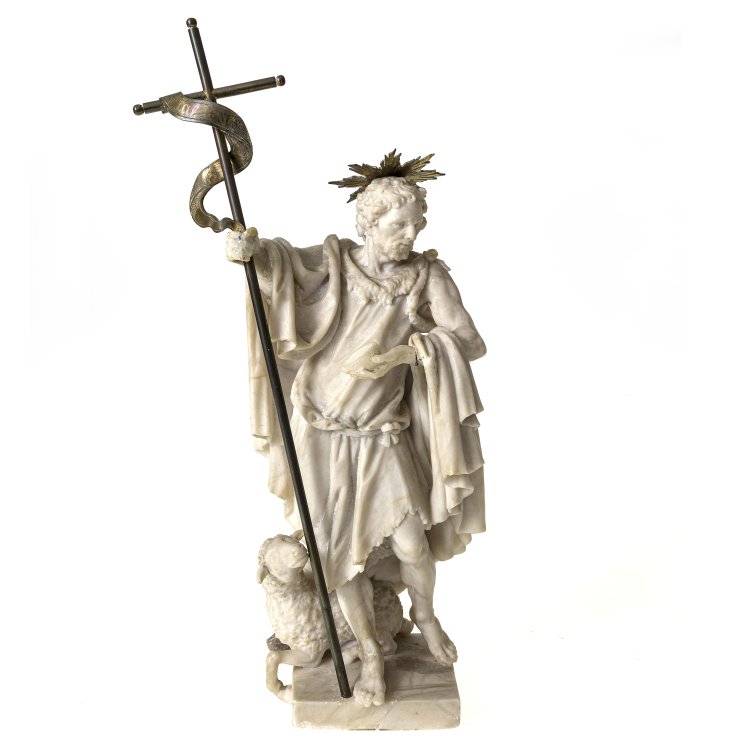 Deutsch, 18. Jh. Stehend mit Fahne, zu seinen Füßen das Lamm. Alabaster. Finger der rechten Hand und linke Hand lose, besch., rep. H. 28 cm.