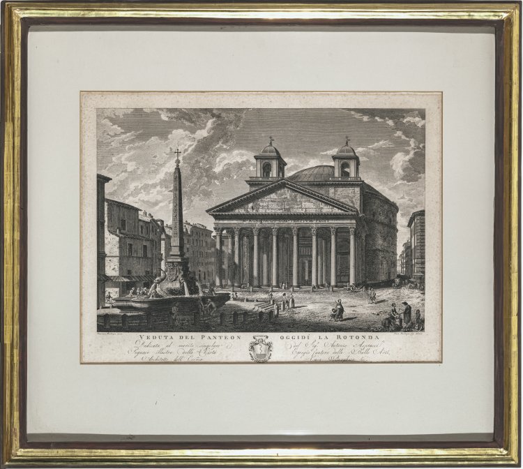 - Darstellung des Pantheon, Druckplatte 38 x 48,5 cm, Blatt 58,5 x 65. Bez. "Veduta del Panteon oggidi la Rotonda", um 1800. "Francesco Barbazza incise", "Paolo Barbazza fig. delineo". In Passepartout und gerahmt.