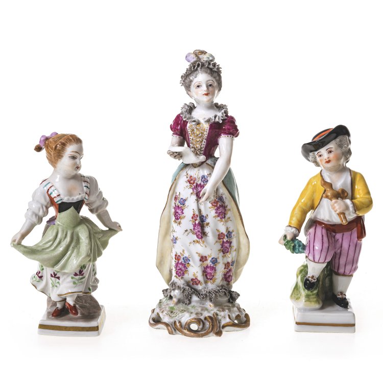 Thüringen, in der Art von Meissen. Porzellan, farbig staffiert. Dame im Zeitkostüm des Rokoko mit Brief, Kinder im Winzerkostüm bzw. in tanzender Pose. Kostüm und Frisur der Dame mehrfach best. H. 10,5-15 cm.