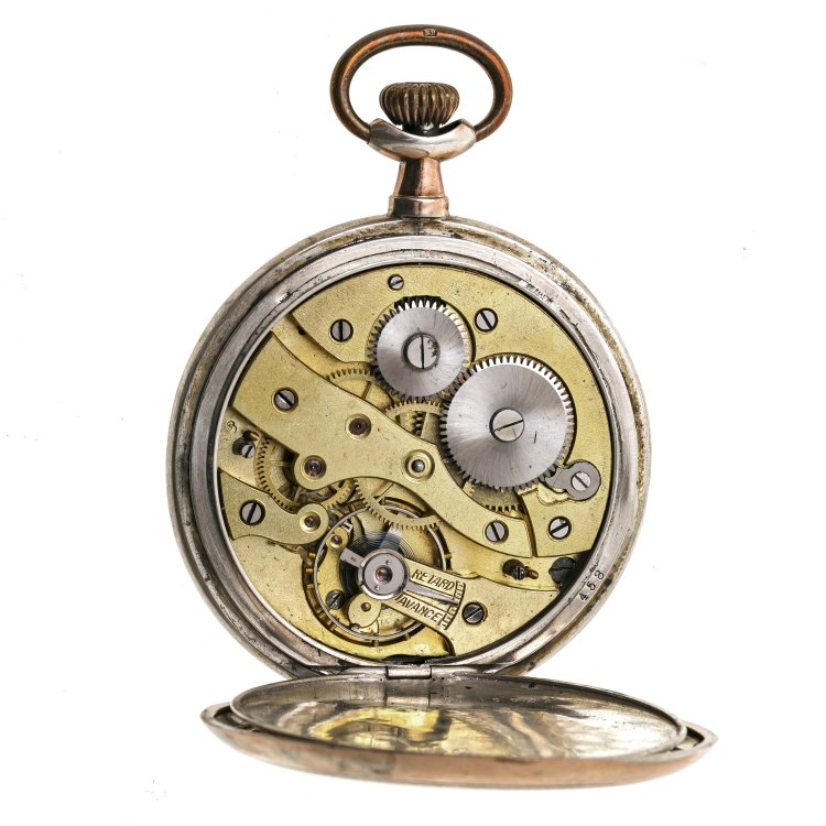 Silber, guillochiert. Emailzifferblatt (besch.) mit arabischen Ziffern, Hilfsblatt für Sekunde. Alterungsspuren, nicht auf Gangbarkeit geprüft. ø 5 cm.