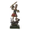 Holz, übergangene Farbfassung. In bewegter Haltung, mit Märtyrer-Palme, den Kessel lässig unter dem Arm haltend. H. 92,5 cm. Rest.