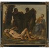 Umkreis François Boucher/Jean Baptiste Greuze. Zwei Gemälde: junger Weinverkäufer bzw. Gebäckverkäufer. Vor dem Weinverkäufer mit seinem Schubkarren steht eine junge Dame mit Weinflasche, die sich in sichtlichem Interesse dem jungen Mann zuwendet. Bei dem Gebäckverkäufer wird deutlich der Standesunterschied zu dem vornehm gekleideten jungen Herrn thematisiert, vor dem der Verkäufer mit seiner Lade nahezu auf die Knie fällt. Öl/Lw. 60 x 50 cm. Rest., doubl. Unsign. Eines rückseitig bez. Boucher.